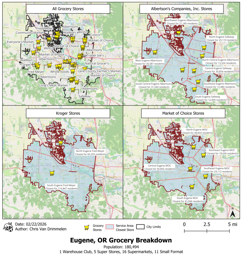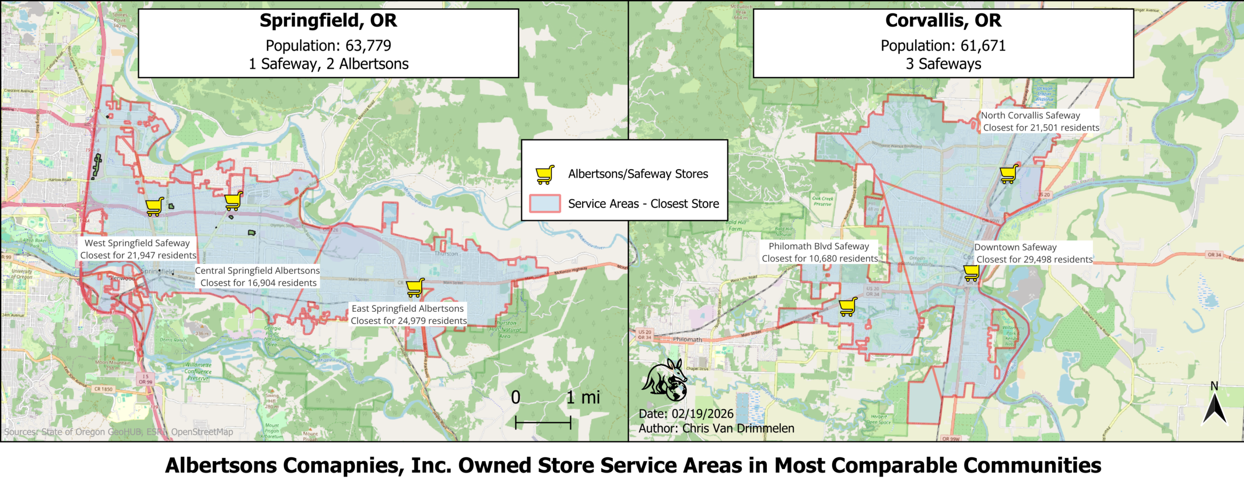 It should also be noted that, while it does not directly border Corvallis in the way that communities like Albany/Millersburg, Salem/Keizer, and even Eugene/Springfield function, the city of Philomath, with a 2025 estimated population of 5,776 lies only a few miles down the highway from the aptly named Philomath Boulevard Safeway. Taking both proximity and the fact that Philomath lacks a grocery store of its own following the closure of its Ray’s Market in 2014, the population served by this store quickly ceases to look like a low-outlier.