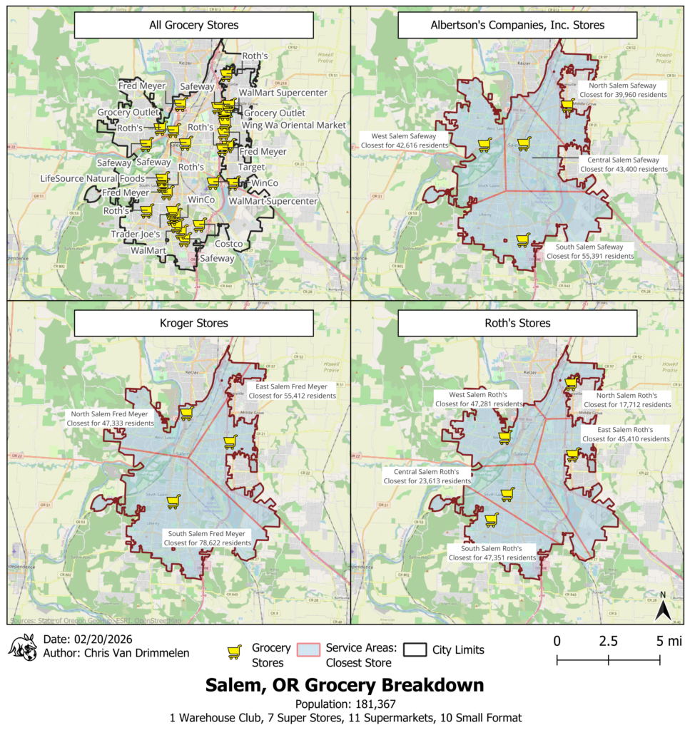 The regional grocery chain Roth’s Fresh Markets, founded in Silverton in 1962, which operates five stores in Salem, is included above with a similar service area breakdown for comparison. Roth’s was acquired by Canadian supermarket conglomerate The Pattinson Food Group in 2021 following the retirement of the chain’s longtime CEO, Michael Roth, son of founder Orville Roth. Roth’s appears to serve, on average, about 36,273 residents per store by proximity. Roth’s does not currently operate directly adjacent to Albany, but operates stores as far from their Salem distribution center as Silverton and McMinnville.